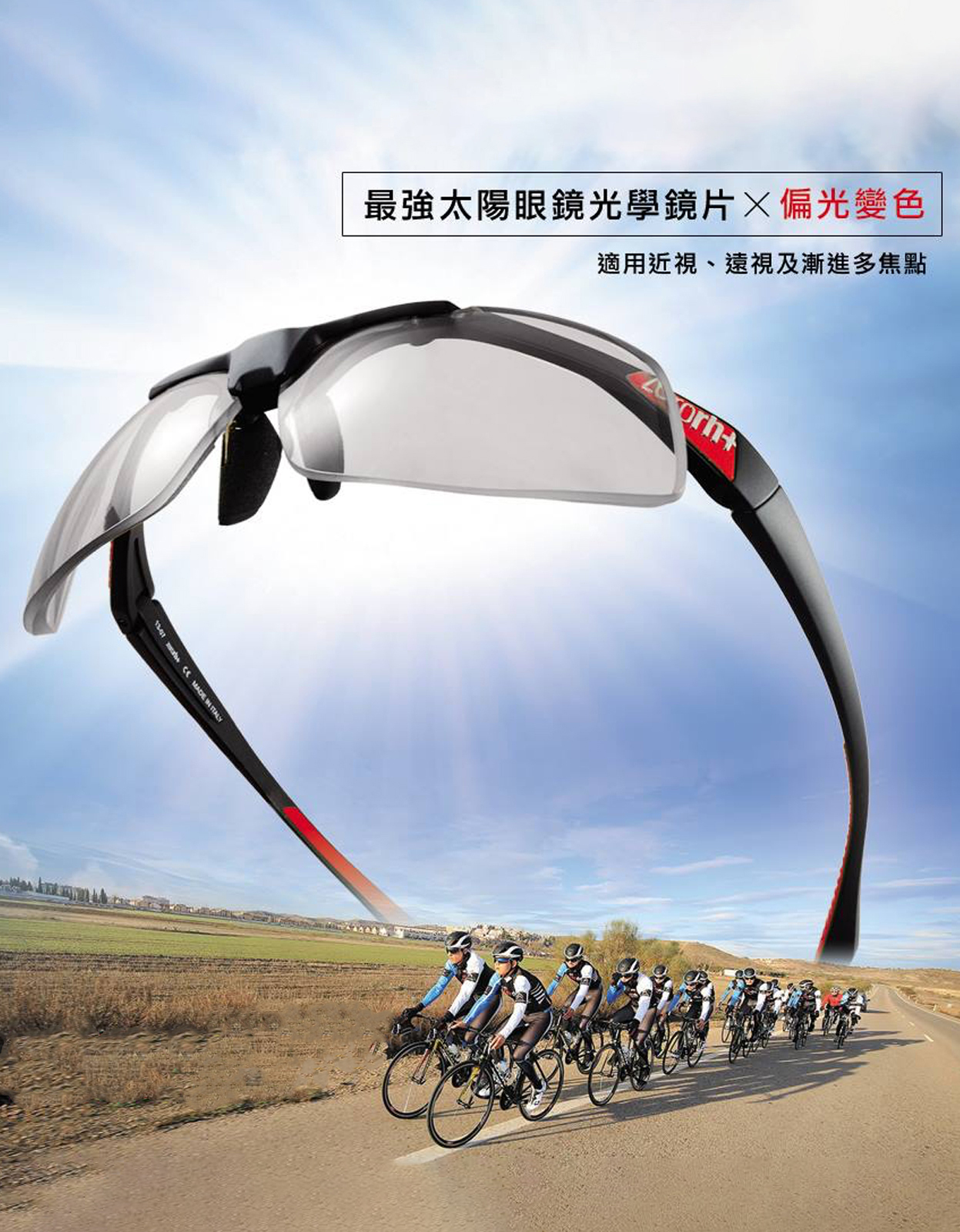 最強運動眼鏡大鏡片的半框,提供您的最闊大的視野;具有高鏡彎的鏡片,滿足視覺需求。極輕鏡框、不只配戴舒適,專有鼻墊支撐確保更佳位置Zerorh+ 的偏光變色鏡片