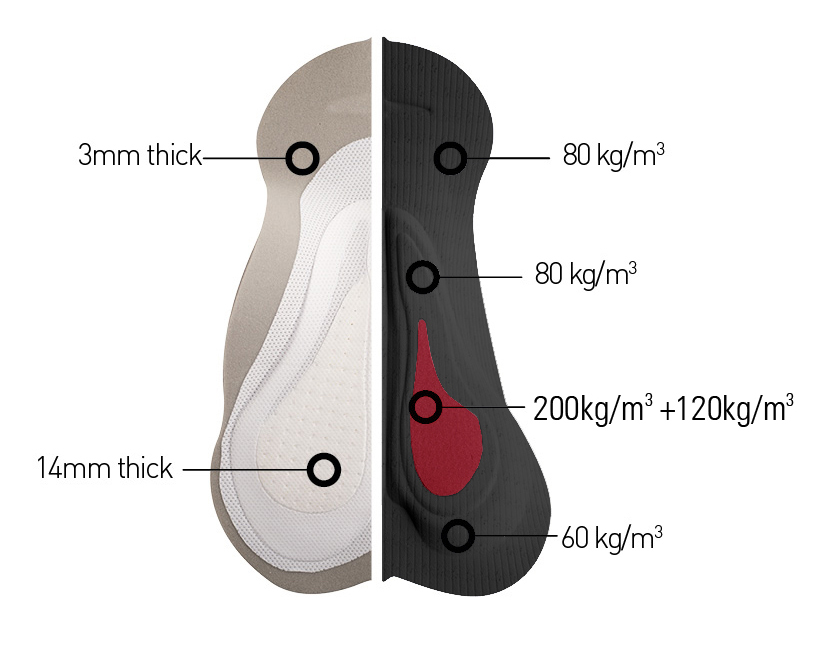 超高密度泡沫應用在長時間騎乘壓力集中的會陰部位;