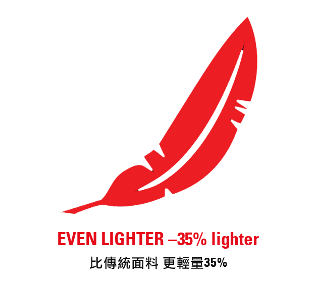比傳統面料更輕量35%,傑出的抗水性、快乾、耐磨損等優異的特性